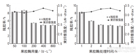 按上述优化工艺处方,即过碳酸钠8 g/L、处理液pH=10、处理温度80℃、处理时间120min,对苎麻纤维进行过碳酸钠预处理后,再按1.2节工艺进行酸性果胶酶处理,探究果胶酶用量、处理时间对苎麻纤维残胶率和束纤维强度的影响,结果见图2。