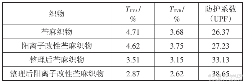 苎麻织物最主要的化学成分是纤维素,难以吸附溶液中带负电荷的黄酮等化合物,因此对苎麻织物进行阳离子改性前处理来提高其吸附性能。采用直接整理法,将织物投入黄酮提取液中,在90 ℃条件下整理1h后测试其抗紫外性能。结果如表1所示。