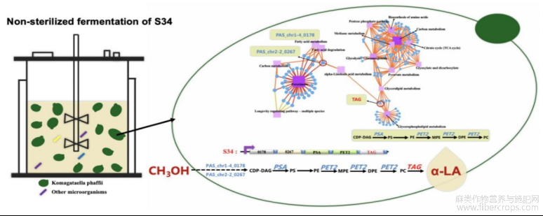 巴斯德毕赤酵母(Komagataellaphaffii,K.phaffii)(简称毕赤酵母)能够利用甲醇作为唯一的碳源,具有较成熟的蛋白分泌表达系统和较高的生物合成能力。通过代谢工程改造,可以将合成α亚麻酸的合成途径引入毕赤酵母中,使其作为细胞工厂合成α亚麻酸,为人类获得重要的ω3脂肪酸提供了一种替代途径,在食品、医药和保健品等领域具有良好的应用前景。