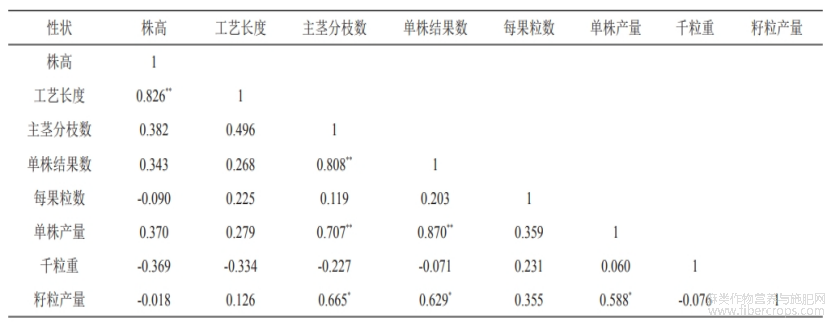 表3 高亚麻酸突变体材料籽粒产量与农艺性状的相关性分析