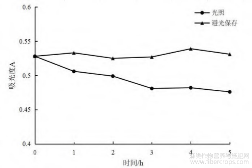 取干燥洁净的试管,并标记为光照组和避光组,之后向其中加入等量总黄酮粗提液,光照组置于阳光下开始光照,避光组放置在阴暗避光条件下,每隔1h开始取样(实验时间5h,共取样5次),使用紫外分光光度计测定样品吸光度值,记录数值,整理并绘图[4,5]。