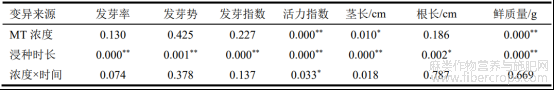 表1 MT浓度和浸种时长对种子萌发特征指数和生长指标影响的方差分析