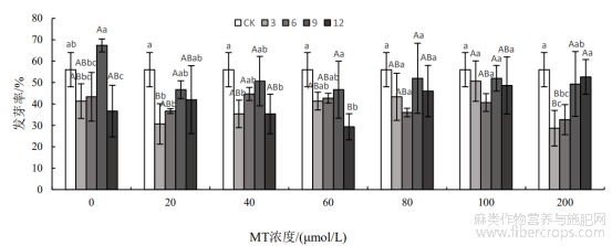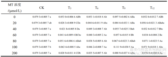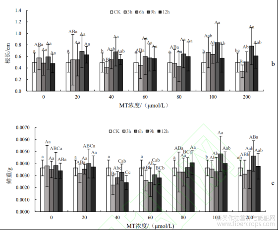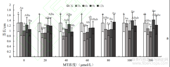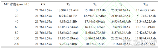 注:不同大写字母表示相同浸种时长下,不同的MT浓度处理间的差异显著(P<0.05);不同小写字母表示在相同的MT浓度处理下,不同浸种时长间差异显著(P<0.05);每个MT浓度处理组均插入了CK;下同
