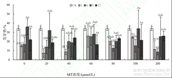 从图2可知,不同浓度的MT和浸种时长对种子的发芽势均有不同影响。发芽势的高低可以反映种子质量的优劣,发芽势高的种子表示种子生活力强、生命力旺盛。与发芽率的情况不同,在浸种9h时,不仅有MT200处理下的发芽势低于12h的情况,而且还有MT40处理的发芽势低于6h和12h以及MT80处理下的发芽势低于12h的情况,但上述差异均不显著(P>0.05)。这说明MT40+T9、MT80+T9、MT200+T9处理下的种子活力较差。经过MT100处理后,种子在3、6、9和12h的浸种时长下发芽势差异不显著(P>0.05)。当种子经过MT0(蒸馏水)+T9处理后,种子的发芽势最高,表明此处理下的种子活力最强,但仅比CK提高了2.00%,差异并不显著(P>0.05)。其余处理均比CK的发芽势低,尤其在MT20+T3处理下的种子发芽势比CK降低了26.67%,差异显著(P<0.05)。综上,MT对罗布麻种子的发芽势并无促进作用,反而具有较为明显的抑制。