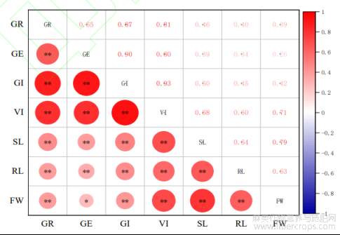 注:SL表示茎长;RL表示根长;FW表示鲜质量;**P<0.01表示极显著相关;*P<0.05表示显著相关