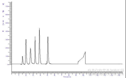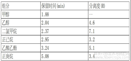精密量取空白溶剂(NN二甲基甲酰胺),甲醇、乙醇、二氯甲烷、正己烷、乙酸乙酯、正庚烷的峰定位溶液及混合对照品溶液各5ml,顶空进样。结果显示,空白溶剂不会对有机溶剂残留造成干扰,各组分均得到完全分离,分离度(R)>1.5,各组分保留时间及分离度见表1,原始气相图谱见图1。