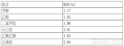 取混合对照品溶液顶空连续进样6次,RSD均在3%以内,见表2。