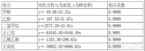 分别精密量取六种溶剂混合对照品储备液0.125mL、0.25mL、0.5mL、1mL、2mL至50mL容量瓶中,用NN二甲基甲酰胺定容至刻度,摇匀,即得到浓度分别为25、50、100、200、400μg·mL1的系列标准工作溶液,顶空进样,以对照峰面积为纵坐标,以甲醇、乙醇、二氯甲烷、正己烷、乙酸乙酯、正庚烷对照品溶液浓度为横坐标,进行线性回归,测定结果见表3。