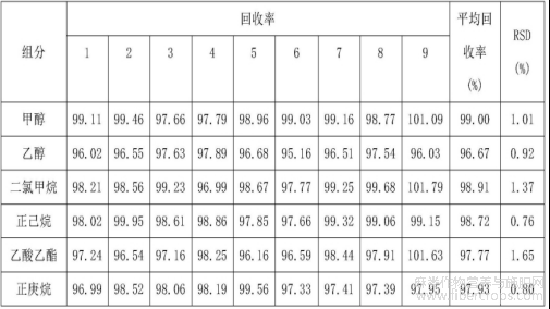 精密称取工业大麻加工提取物0.1g共9份,分别置于10ml量瓶中,以此加入5ml的甲醇、乙醇、二氯甲烷、正己烷、乙酸乙酯、正庚烷混合对照品溶液,加入NN二甲基亚砜稀释至刻度,摇匀,作为回收率样品溶液,各取5ml顶空进样,记录色谱图,计算回收率。经测定结果计算回收率在95%~102%之间(100%±5%),结果见表4。