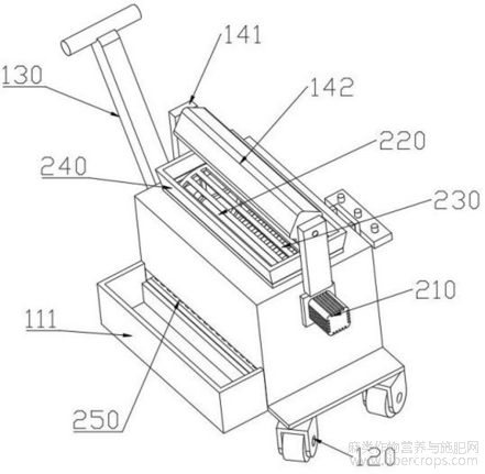 在一些优选的实施例中,所述收集安装主体110的上端面还设有枯叶去除机构140,所述枯叶去除机构140包括有安装支架141和风扇142,所述安装支架141安装在所述收集安装主体110的上端面,所述风扇142安装在所述安装支架141上,所述风扇142与所述控制部电性连接,所述风扇142的输出端斜切于所述筛分滚笼230的周面。通过所述风扇142将位于所述接料敞口240处的干叶片等从所述接料敞口240吹出,避免较大的杂物对所述筛分滚笼230的漏料通孔堵塞。
