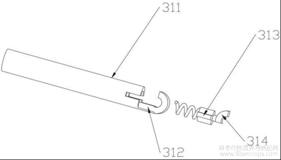 在一些优选的实施例中,所述作用件310包括有安装杆311、卡持钩312、弹簧、拨动块313和弹性抵块314,所述安装杆311转动设于所述可伸缩输出杆350的端部,所述卡持钩312安装在所述安装杆311的端部,所述安装杆311的端部上设有滑槽,所述安装杆311上沿其径向设有安装槽,所述弹簧一端连接至所述安装槽的槽底,另一端与所述弹性抵块314连接,所述弹性抵块314滑动设于所述安装槽中,所述拨动块313设于所述弹性抵块314上,所述拨动块313滑动设于所述滑槽中,通过所述卡持钩312与所述弹性抵块314的共同作用以夹持柱植株的主茎。由于每根植株的主茎直径大小都不相同(植株高1.5-1.8m,主茎1.5-3.5cm(2.5-3.5cm居多)),因此该作用件310设置成弹性件,以适配不同直径大小的植株的夹持,确保振动的稳定传递。
