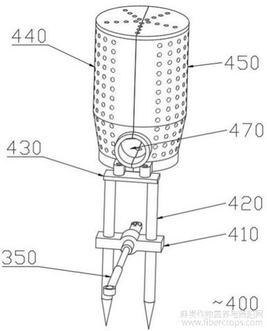 在一些优选的实施例中,所述收种输料机构400包括有安装转套410、固土插杆420、安装座板430、第一半网筒440、第二半网筒450和柔性输送道460,所述安装转套410套设在所述安装杆311上,所述安装转套410的相对两端上均设有延伸块,所述延伸块上贯穿设有插孔,所述固土插杆420穿过所述插孔插设于土壤中以实现对收种输料机构400的固定,确保在采收过程中的稳定性,所述安装座板430安装在所述固土插杆420的上端面,所述第一半网筒440与所述第二半网筒450转动安装在所述安装座板430上,所述第一半网筒440与所述第二半网筒450的任一上设有插槽,另一上设有插块,通过所述插槽与所述插块的配合,以使所述第一半网筒440与所述第二半网筒450组成一个完整的网筒并环套于植株的主茎上,并通过所述第一半网筒440与所述第二半网筒450罩住主茎以上的分支以防止植株种子显露在外被鸟类啄食,所述第一半网筒440与所述第二半网筒450的内周端面处均设有弹性半圆膜470,当网筒环套于植株的主茎上时,所述弹性半圆膜470抵接至植株的主茎以封闭主茎与网筒内周的间隙,防止种子从所述网筒中漏出,所述网筒上设有一衔接缺口,所述柔性输送道460安装在所述衔接缺口上,所述柔性输送道460的另一端拉至所述筛分除杂机构200上方,并固定于所述收集安装主体110上。所述第一半网筒440与所述第二半网筒450为顶部封闭结构式,通过两者组合而成的网筒可以将植株主茎以上的枝叶包括种子部分全部套设在网筒内,有效的防止在种子成熟的过程中鸟类的啄食,亦或是种子脱落掉落到地上影响采收后的统计数据。
