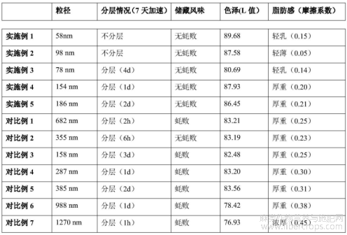 表1给出了实施例1~5和对比例1~7的轻乳饮品的实验数据,从表1中可以看出,在实施例1的实验条件下获得的轻乳的稳定性、储藏风味以及口感都是最好的,实施例2在实施例1的基础上减少了低聚果糖的添加量后粒径稍大,且脂肪感较为轻薄,说明低聚果糖的添加量会影响植物乳的口感,但对稳定性和风味影响不大。而实施例3在实施例1的基础上增加了抗氧化剂(茶多酚和迷迭香提取物)的用量,虽然对风味和口感影响不大,但可以看出轻乳的稳定性明显有所下降,且色泽明显变暗,这说明抗氧化剂的添加量会影响植物乳的稳定性和抗氧化性,且添加量较多会导致稳定性下降。实施例4和实施例5为本发明的两种极限情况,实施例4在实施例1的基础上使用了过多的酶酶解较长时间,且亚麻籽的粒径,低聚果糖和抗氧化剂的添加量都是最极限的情况,在此条件下,轻乳的脂肪感会受到影响,最主要的是轻乳的稳定性明显下降,实施例5也是同样的问题。实施例4和实施例5虽然稳定性明显下降,但其口感的风味是在可接受的范围内。