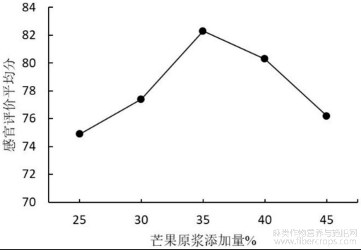 在指定火麻仁原浆的添加量为17.5%,乳粉添加量为3.5%,果脯糖浆添加量为7%的基础上,芒果原浆添加量分别为25%、30%、35%、40%、45%,探究芒果原浆添加量对芒果火麻仁饮料的口感品质的影响,具体评分数据见图1。