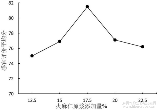 在指定芒果原浆的添加量为35%,乳粉添加量为3.5%,果脯糖浆添加量为7%,火麻仁原浆添加量分别为12.5%、15%、17.5%、20%、22.5%,探究火麻仁原浆添加量对芒果火麻仁饮料的口感品质的影响,具体评分数据见图2。