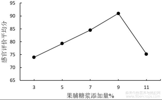 在指定芒果原浆添加量35%,火麻仁原浆添加量为17.5%,乳粉添加量为3.5%,果脯糖浆添加量分别为3%、5%、7%、9%、11%,探究果脯糖浆添加量对芒果火麻仁饮料的口感品质的影响,具体评分数据见图4。