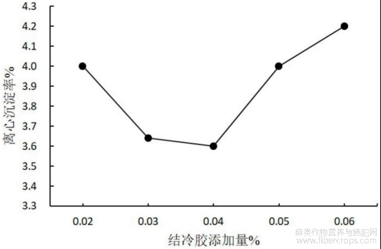 由图5可知,结冷胶添加量对于饮料产品的离心沉淀率先呈下降趋势至最低点后升高,在结冷胶添加量为0.04%时,离心沉淀率最低,当结冷胶添加量低于0.04%时,离心沉淀率较高饮料不稳定,当结冷胶添加量慢慢增加高于0.04%时,饮料沉淀较多,略有絮状沉淀,导致稳定性大大降低。因此,结冷胶添加量为0.04%较适宜。