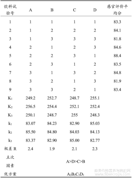 表2 芒果火麻仁饮料最优配方正交试验设计结果