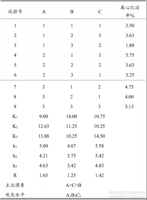 经过稳定剂复配正交试验结果分析,通过查看极差R值,三个稳定剂因素对芒果火麻仁饮料的配方优化的离心沉淀率(%)影响排序为:结冷胶>单甘脂>CMC,结冷胶是主要影响因素,对饮料产品的离心沉淀率影响显著,其它两个稳定剂为次要因素,只是协同结冷胶起到悬浮作用。通过比较K值可知,A1B3C2为最佳稳定剂组合,即结冷胶0.03%、单甘脂0.06%、CMC-Na0.15%
