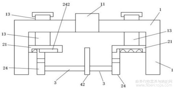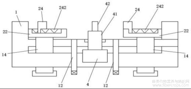 本发明实现多个多孔抵压板24的水平移动,使得亚麻纤维得到纵向分布的挤压,如此使得亚麻纤维的挤压面积大,挤压厚度小,如此使得清洗脱胶的效果更好。