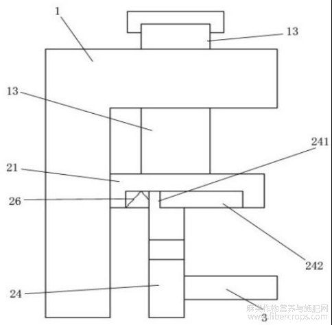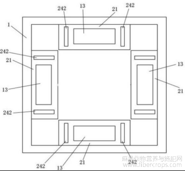 如图1至6所示,为了便于多孔抵压板24可以向内侧复位,给亚麻纤维空间与清洗 水充分接触,进一步,所述多孔抵压板24的上下端部两侧分别设有滑动卡齿241;所述上定 位板21和下定位板22两侧均匀开设滑动卡槽242;所述滑动卡齿241滑动卡接于滑动卡槽 242上;所述滑动卡槽242内设有抵压弹簧26;所述抵压弹簧26向内侧抵压滑动卡齿241。