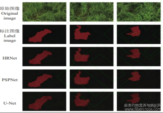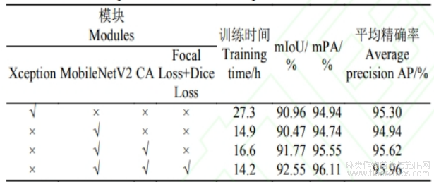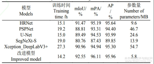 因此本文对于DeepLabV3+进行了更加轻量化的改进,改进的DeepLabV3+在胡麻倒伏识别中表现最佳,mIoU达到了92.55%,mPA为96.11%,平均精确率为95.96%,表明改进后的DeepLabV3+能够更好地捕捉胡麻倒伏区域的关键特征。相较于原始的DeepLabV3+,改进后的模型在mIoU、mPA、平均精确率上均有提升,并且在精度和训练速度上均优于训练表现最优的HRNet。同时,在模型的训练时间上,减少至14.2h,训练速度得到了极大的提升。