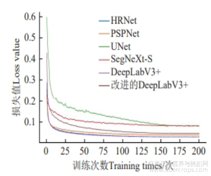 基于自建的胡麻倒伏数据集,试验分别对HRNet、PSPNet、U-Net、SegNeXt-S、DeepLabV3+以及本文提出的改进模型分别测试了其分割性能,其损失曲线如图5所示,各个模型的损失曲线均进行了平滑处理,各个模型在200轮的训练批次下均已达到收敛。