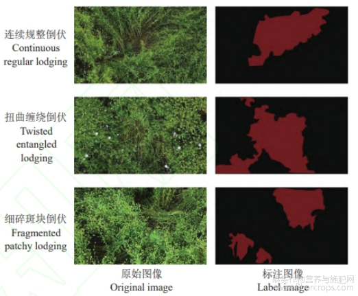 对于收割机拍摄的486张4032×2268像素大小的原始图像进行筛选去重。由于接近成熟期的胡麻倒伏和未倒伏区域的差别较为显著,胡麻的种植密度较大,对于未倒伏区域的胡麻可以显著看到胡麻籽以及开花部位,而对于倒伏区域的胡麻,则是看到胡麻茎秆,甚至在倒伏严重区域可以看到地面。本试验采用labelme版本3.16.7对图像中胡麻倒伏区域进行标注,标注的数据集包括倒伏和背景两个类别,示例图如图1所示。标注后对图像和标注文件进行随机数据增强以增加模型的泛化能力,包括切割、缩放、旋转、高斯模糊、添加噪声、色域变换等,得到处理后的数据5346张,达到了模型的训练要求。把数据集按照8:2进行划分训练集和验证集,最终得到4276张图像作为训练集,1070张图像作为验证集。