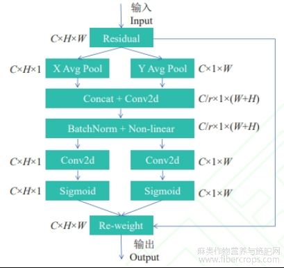 坐标注意力机制(coordinate attention, CA)[27]一种用于提升卷积神经网络(CNN)性能的注意力机制。CA机制在移动网络(如MobileNetV2和MobileNeXt)中非常有效,显著提升了模型在图像分类、目标检测和语义分割任务中的性能[27]。CA的核心思想是将通道注意力分解为两个1D特征编码过程,分别沿水平方向和垂直方向聚合特征。这样不仅能捕获通道间的关系,还能保留精确的位置信息,从而更准确地定位目标。胡麻倒伏通常是发生在局部区域,倒伏区域的位置信息对识别至关重要,CA可以通过分解水平和垂直方向的注意力机制,从而精确捕捉数据的空间位置信息,增强模型对倒伏区域的敏感性。在数据图像中,倒伏的面积可能较小,传统方法容易忽略,CA通过全局池化和位置编码,可以增强模型对小尺度倒伏区域的识别能力。同时对于作物收割的实时性要求,CA的计算开销较小,在处理大量农田图像时,能在不显著增加模型复杂度的同时提升模型性能。该注意力机制结构如图4所示。
