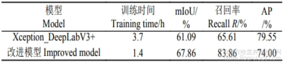 本文将模型统一训练150轮,模型均可收敛,可以看到,本文改进的模型在此数据集上的性能表现也较为突出,相比基础的DeepLabV3+模型,在少量牺牲mPrecision的同时,训练时长大幅度降低,由3.7h降低至1.4h,mIoU、召回率(recall,R)均有大幅度提升。