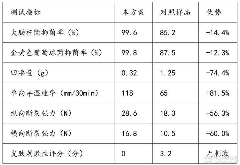 在另一实施例中,以传统卫生巾面层制备工艺为基准,选取与本方案进行对比,验证本方案在纤维选择?改性工艺?功能成分负载?结构设计等方面的具体情况?