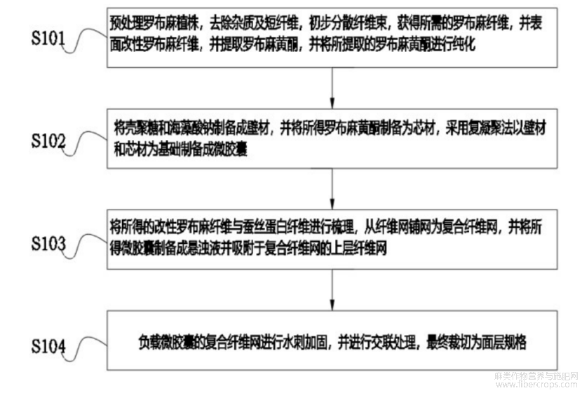 S101?预处理罗布麻植株,去除杂质及短纤维,初步分散纤维束,获得所需的罗布麻纤维,并表面改性罗布麻纤维,并提取罗布麻黄酮,并将所提取的罗布麻黄酮进行纯化;
