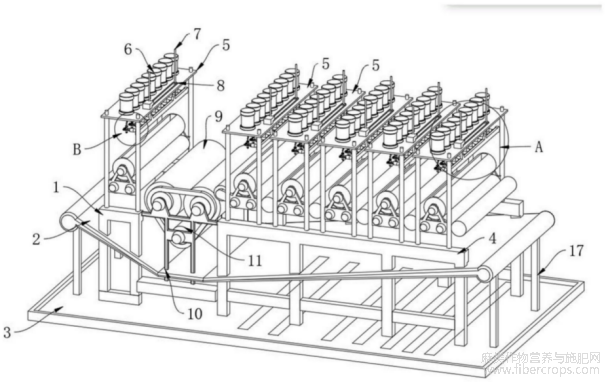 3.根据权利要求2所述的一种利用水刺原理的苎麻分梳成带机,其特征在于:所述喷淋组件包括喷淋罐(6)和侧安装箱(16),所述喷淋罐(6)设置有多组且等距安装在所述上支撑架(5)的上表面,所述上支撑架(5)的下端固定连接有软管(15),所述软管(15)的下端固定安装有喷淋嘴(14),所述侧安装箱(16)设置在所述喷淋嘴(14)的一侧,所述侧安装箱(16)上转动安装有多组转动块(12),所述转动块(12)上固定安装有连接板(13),所述喷淋嘴(14)与所述连接板(13)固定连接且下端延伸到其下方。
