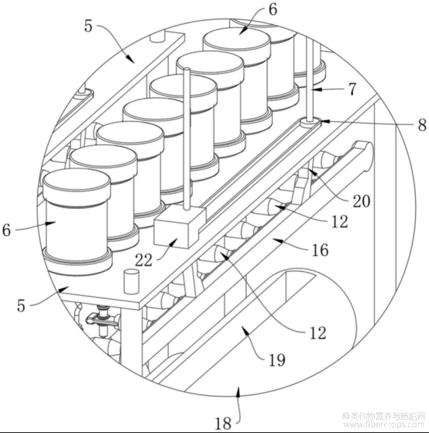 其中,侧安装箱16的上表面固定安装有连接块20,连接块20的上端固定安装有螺纹杆7,相邻螺纹杆7之间设置有传动件8,传动件8由两组传动轮和传动带组成,传动轮转动连接在上支撑架5的上表面而传动带套接在传动轮外侧,传动轮与螺纹杆7螺纹连接,上支撑架5上均固定安装有齿轮箱22,齿轮箱22内设置有转动电机和两组相互啮合的传动齿轮,转动电机的输出端与其中一组传动齿轮固定连接,另一组传动齿轮与传动轮固定连接。本发明中通过侧安装箱16的移动可以调整喷淋嘴14的高度,转动电机驱动相互啮合的传动齿轮转动,进而带动传动轮转动,通过转动轮与螺纹杆7的相互作用,实现螺纹杆7的升降调节,以此调整侧安装箱16的高度,进而调整喷淋嘴14的高度,从而控制喷淋组件在苎麻纤维分梳过程中的冲压强度。
