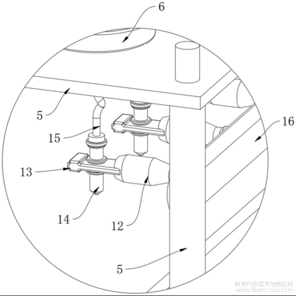 14,侧安装箱16设置在喷淋嘴14的一侧,侧安装箱16上转动安装有多组转动块12,转动块12上固定安装有连接板13,喷淋嘴14与连接板13固定连接且下端延伸到其下方。本发明中喷淋嘴14通过软管15与喷淋管6固定连接,软管15为可伸缩管,导液管组的上端与所述喷淋罐6的上端固定连接,循环水体通过导液管组进入到喷淋罐6内,再由喷淋罐6和软管15从喷淋嘴14输出。