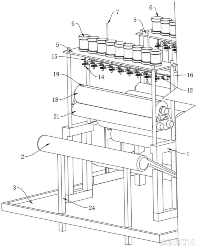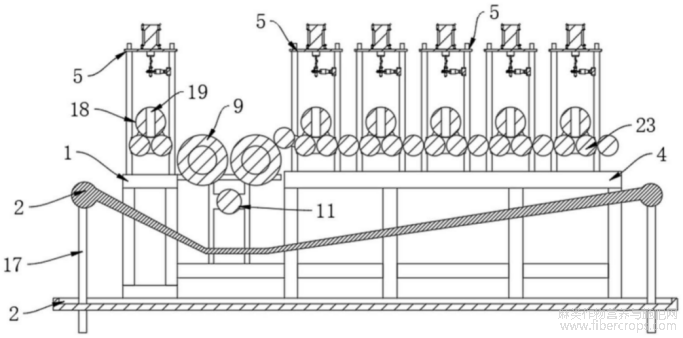 其中,水刺单元包括上支撑架5,上支撑架5上平行设置有喷淋组件和导料组件,导料组件包括转动辊21和定位辊18,转动辊21设置有两组且平行转动连接在上支撑架5的下端,两组转动辊21的中间位置固定安装有定位辊18,定位辊18的中间位置竖向开设有水刺槽19。本发明中苎麻纤维在转动辊21的带动下移动,经过定位辊18时,喷淋组件喷出的水流通过水刺槽19对苎麻纤维进行分梳处理。