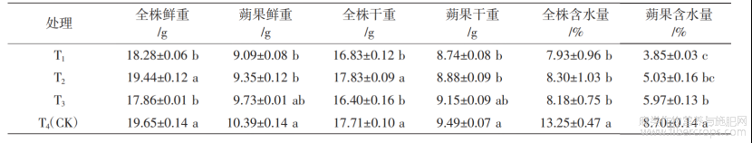 表2 不同药剂处理对胡麻全株、蒴果干鲜重及含水量的影响