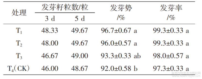 表3 不同药剂处理对胡麻种子发芽势、发芽率的影响