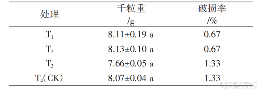 表4 不同药剂处理对胡麻籽粒千粒重、破损率的影响