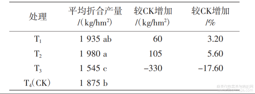 由表5、表6可看出,不同催熟药剂对胡麻产量构成各农艺性状指标未产生显著影响。不同处理平均折合产量存在显著差异(P<0.05)。平均折合产量以处理T2最高,为1980kg/hm2,较T4(CK)增产105kg/hm2,增产率5.60%;其次为处理T1,为1935kg/hm2,较T4(CK)增产60kg/hm2,增产率3.20%;处理T3则减产17.60%。