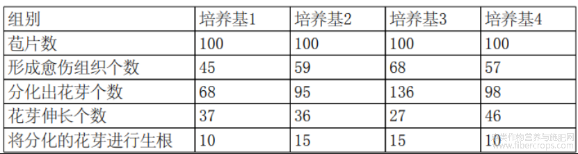 花芽分化:愈伤组织进一步分化形成花芽,分化情况呈现多样性,单个愈伤组织分化出花芽数量在1至3个不等,最终统计分化产生花芽总个数;