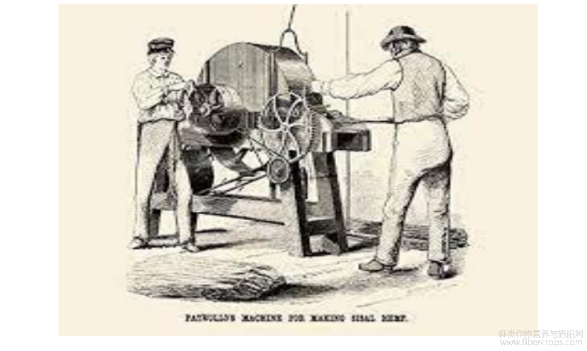 欧美对剑麻纤维的大量需求刺激了剑麻纤维机器化的创新。墨西哥的印第安人曾经用木槌敲打剑麻叶,然后用锋利的木头刮掉叶子上的肉,从而获得部分纤维。西班牙人迅速对这一原始的加工方式进行了重大改进,他们创造并引入了一种名为“戈配尔”的简易机械装置,专门用于抽取剑麻叶片中的汁液。这种机器在桌子的一侧将轮子围起来,轮子和桌面之间有一个狭窄的缝隙,里面插着许多片剑麻叶。剑叶不是沿其整个长度插入,而是仅插入间隙的一半,这样叶子的一半纤维就完全裸露在外。随后,将剑麻叶的另一半推入压区,并将裸露的纤维缠绕于手上,紧紧握住。这样,整片叶子的纤维在几秒钟内就暴露出来了,这台机器虽然简单,但很有效[39],见图2。之后,尤卡坦当地人何塞·埃斯特班·索利斯在1857年发明了剑麻搓磨机。到19世纪60年代,茎动力旋转锉刀机提取纤维更为快速,改进了脱皮技术[40]。工业革命期间,随着对天然、环保材料需求的增加,剑麻产业实现了规模化发展。搭乘工业革命的东风,剑麻在19世纪后半叶开始走出墨西哥,在美洲、非洲、亚太地区迅速传播。