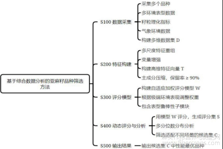 S100具体包括:所述表型特征数据包括生育周期动态变化曲线、叶面积指数及生物量变化率,所述理化指标数据包括α亚麻酸含量、木酚素积累速率及籽粒水分代谢参数,所述环境气象数据包括温度、日照、降水频率与气候异常因子。