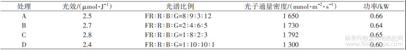 试验共设4个处理,即LED光源中远红光(FR)、红光(R)、蓝光(B)、绿光(G)的比例分别为8∶9∶3∶12(A)、2∶4∶6∶5(B)、1∶8∶2∶3(C)、1∶10∶10∶1(D)。各处理LED光源参数见表1。每个处理6次重复,随机区组排列。