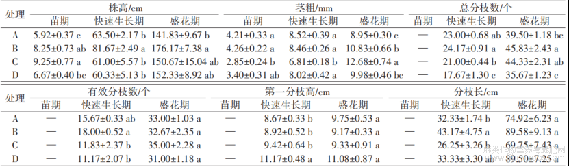 在工业大麻苗期、快速生长期和盛花期,参照《大麻种质资源描述规范和数据标准》[13]测定各处理工业大麻的株高、茎粗、总分枝数、第一分枝高、分枝长和有效分枝数。