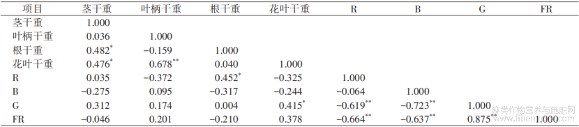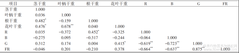 表4 工业大麻生物量性状与 LED 光谱的相关性分析