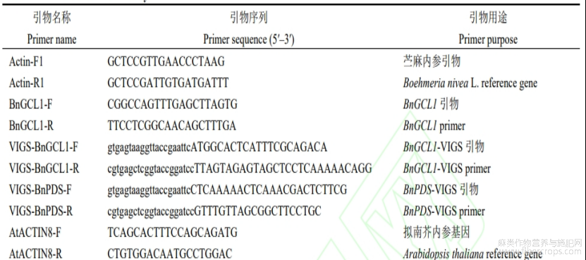 苎麻材料为中苎一号,由湖南农业大学苎麻研究所提供。拟南芥(Arabidopsis thaliana)Col-0、pCAMBIA1300-35S-BnGCL1-myc过表达载体、pTRV1、pTRV2-VIGS载体均来自本实验室保存。根癌农杆菌GV3101(CAT#:AC1001),以及大肠杆菌菌株TOP10(CAT#:DL1010)、DH5α(CAT#:DL1001)均购自上海唯地生物技术有限公司。