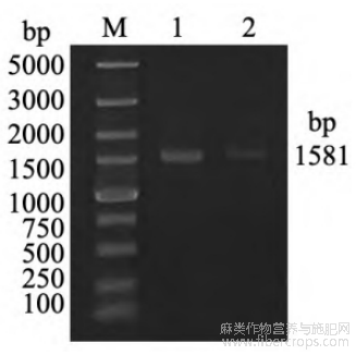 在提取苎麻叶片的RNA后,反转录获得cDNA。基于BnGCL1基因序列设计BnGCL1基因的特异性扩增引物(表1)。利用引物进行PCR扩增试验,并通过琼脂糖凝胶电泳技术对扩增产物进行检测。结果显示,成功扩增出条带大小为1581bp的目标片段(图1),标志着BnGCL1基因片段的成功获取。