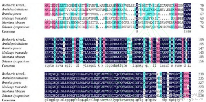 黑色表示序列同源性为100%,粉红色表示序列同源性大于75%,蓝色表示序列