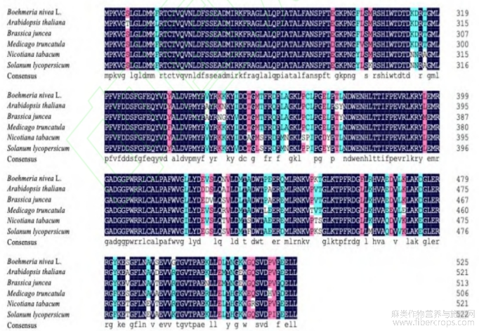 用NCBI的BLASTp对BnGCL1蛋白进行氨基酸相似性搜索发现,苎麻BnGCL1蛋白与烟草(Nicotiana tabacum,Q1W2L8.2)、拟南芥(Arabidopsis thaliana,P46309.2)、番茄(Solanum lycopersicum,O22493.1)、芥菜(Brassica juncea,O23736.1)、苜蓿(Medicago truncatula,Q9ZNX6.1)的氨基酸序列相似性较高,相似性分别为82.7%、82.35%、80.8%、80.8%、83.5%(图2)。利用DNAMAN进行多重序列比对发现,PLN02611结构域在不同物种间表现出高度的保守性。